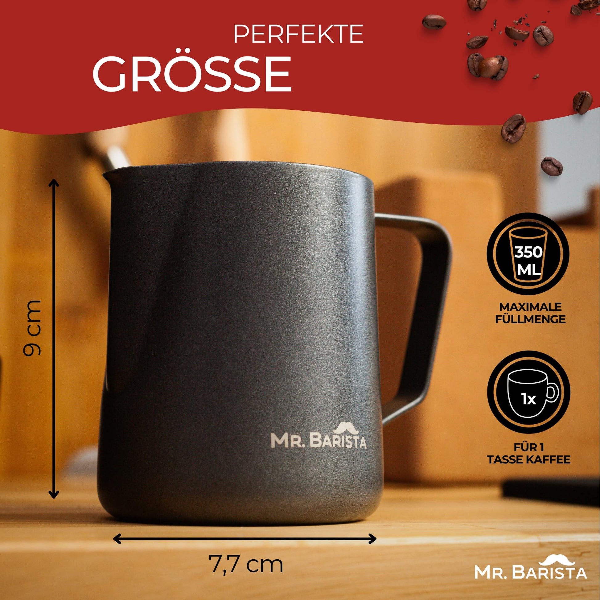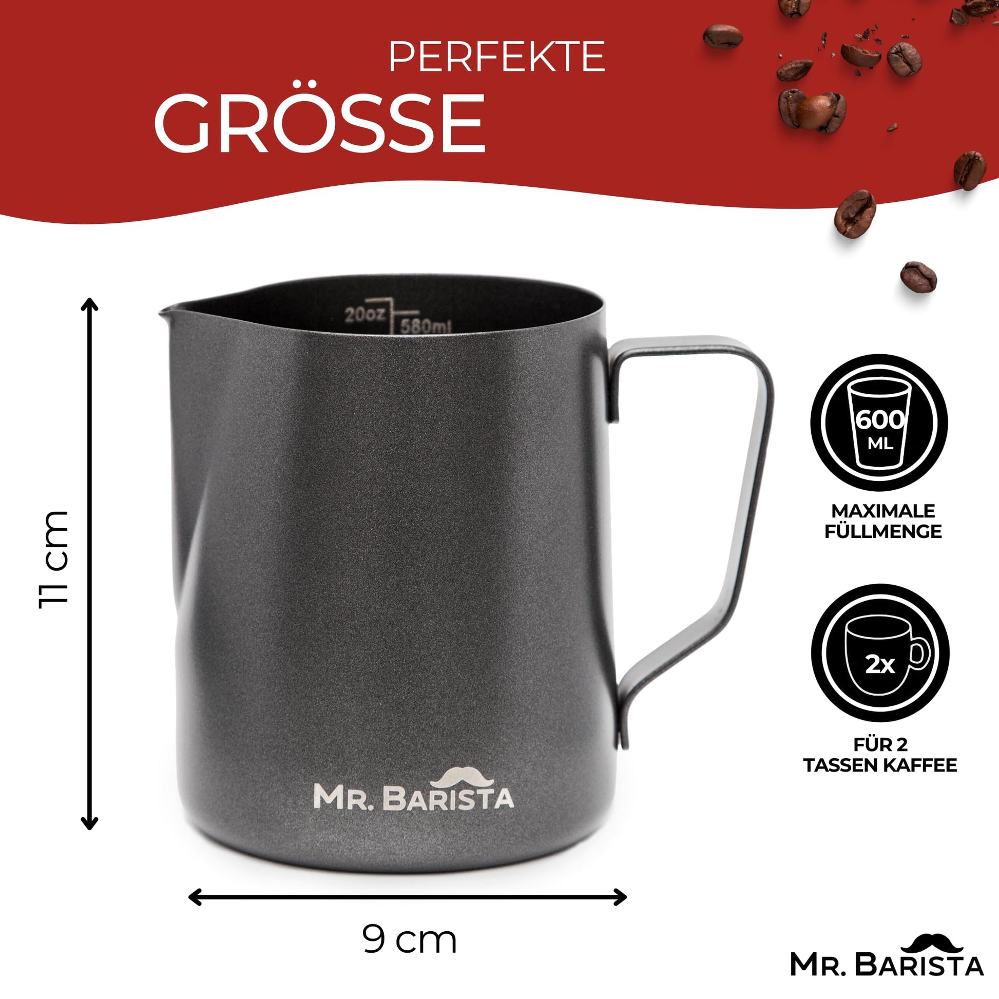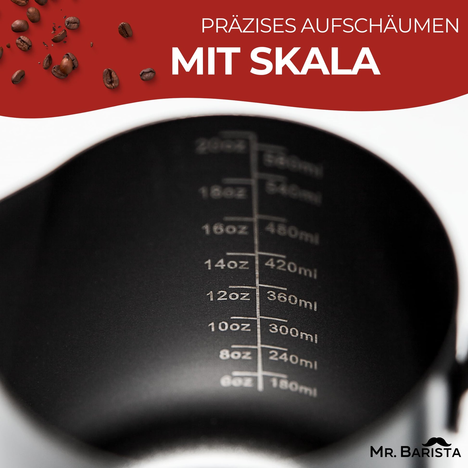 The professional Mr. Barista milk jug is made of high-quality and robust 304 stainless steel and is coated with Teflon. The milk jug also has a specially shaped latte art spout and a measuring scale. Cleaning is also very easy: after use, the milk jug simply goes in the dishwasher. It is absolutely dishwasher safe and rustproof!